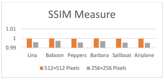 Text files were tested as a type of secret message contained in the cover colour image. The parameters for measuring the payload were thus the size of the encrypted text file and whether or not this was successfully included inside the cover image. When the proposed methodology was compared with the method in [35], it was seen to significantly reduce MSE while, as shown in Table 2, keeping the PSNR consistently over 40 dB [52], implying that any degradation in quality would be hard to detect with the human eye. The same is true for the bias and SSIM analyses, which bears mentioning in consideration of the concerns raised in [35,53]. As the bias value is low, the SSIM value is also close to 1. It is also important to note that this embedding capacity is based on hiding two bits in each byte of the cover image, which means that using three colour image channels offers a high storage capacity.