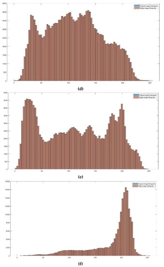 An image histogram is one of the most critical criteria in statistical image steganography. It displays the pixel density for each brightness value, allowing evaluation of full tonal distribution at a glance based on the histogram for a given image. The histograms for each cover image and stego-image were thus calculated to evaluate the proposed technique using histogram analysis, as shown in Figure 10. Figure 10 illustrates that the histograms of each image cover and its stego-image differ only slightly. As a result, the distortion of the pixel values in the stego-image is reduced, creating no noticeable impacts on the histogram or the visual quality of the resulting colour images.