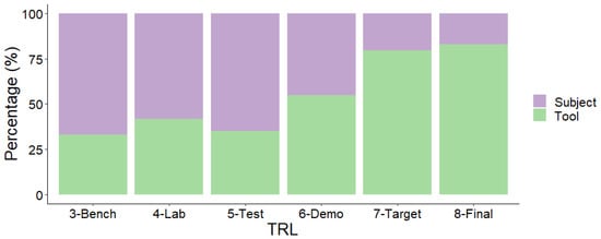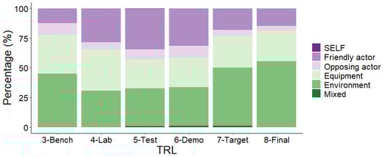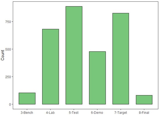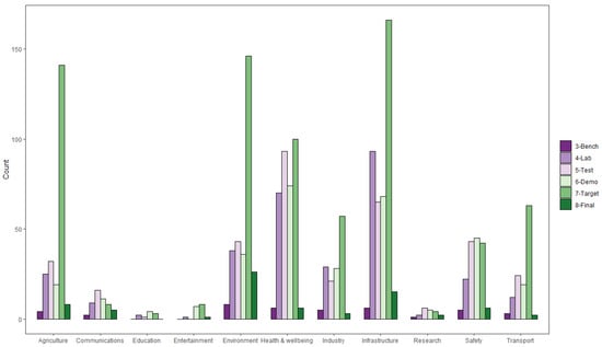 The distribution of these deployments among different technology readiness levels (TRL’s) is presented in Figure 2. A consequence of the original research question is that there are no deployments related to TRL levels 1 and 2 as basic technology research does not assume activities with deployments, and TRL level 9 does not involve any publishable research, thus, the results only contain deployments in range from TRL 3 to TRL 8. The smallest amount of deployments is related to TRL 3 with 3.37% (103) of all deployments and TRL 8 with 2.65% (81) of all deployments—in these cases, deployments are rarely used or results of corresponding usage are rarely published. Most deployments—93.98% (2875)—are related to TRL 4–7. Distribution of deployments between these four levels shows a rather low—15.66% (479)—number of deployments used for demo purposes, with more significant usage for tests—29.03% (888)—and for validation in target environment 27.00% (826). The rest—22.30% (682)—of deployments are used for validation in laboratory environment.