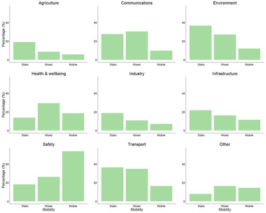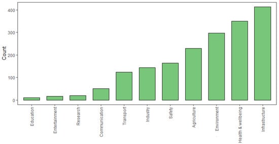 As shown in Figure 3, common fields of the goal network in sensor network deployments are infrastructure 22.63% (413) and health and wellbeing 19.12% (349). Less frequently deployments are dedicated to fields of environment 16.27% (297), agriculture 12.55% (229), safety 8.93% (163), industry 7.84% (143) and transport 6.74% (123). Other domains are very rare, altogether 5.92% (108) across four of the most unrepresented fields of the goal network—communication, research, entertainment and education. These underrepresented domains with a small amount of related deployments could yield promising research avenues with potential low-hanging fruit results.