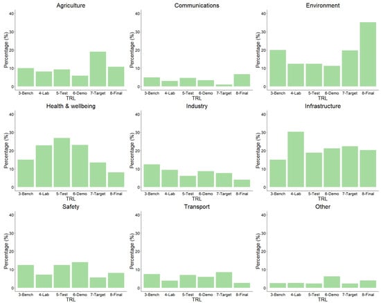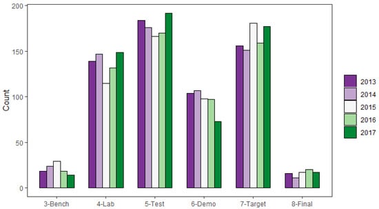 The percentage of deployment TRL is similar in all years, except for year 2015. In 2015, deployment TRL compared to other years seems to have shifted more to higher TRL levels, as shown in Figure 4, the reason for this deviation is unclear. In 2017, TRL6 had a much lower deployment count than in other years. The gap in normal distribution created by TRL6 deviation most probably is caused by blurred lines in the used definitions between adjacent TRL levels—this trend was also shown above in Section 3.1.2.