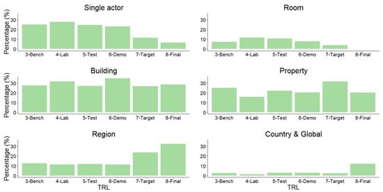 Even though the deployment itself might be relatively small-scale, some deployments are meant to lay the ground for large-scale deployments. When looking at the target deployment sizes (Table 3) the most typical ones are building and property scale, followed by single actor and region scale. Room, country and global scale, on the other hand, are much less represented. In these results, “None” means that no scale information of target deployment was clearly provided or defined.