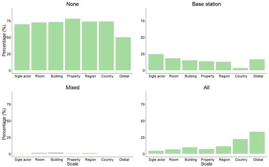 The scale of wireless sensor networks (single actor, room, building, property, region, country, and global) is distributed quite similarly in usage fields except for some of the usage scales which are highly popular compared to other scales. For example, in the field of agriculture, by far the most common scale is property (71%), but in the field of environment, there are two common scales—property (26%) and region (54%). Similarly, the field of health and wellbeing has two most common scales—building (27%) and single actor (55%), whereas infrastructure has only one most common scale—building (59%). The country and global scales in all fields are the least common scales, probably, because of the range.