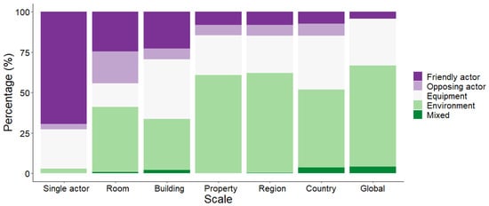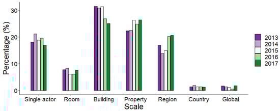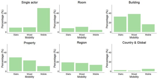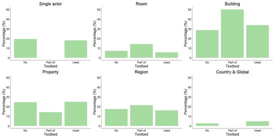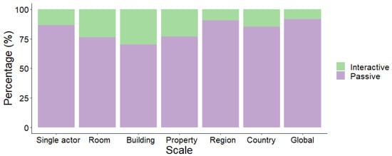 The largest number of interactive sensor networks are deployed in Buildings (158/42.13%), as displayed in Figure 29. The interactivity of deployed sensor networks seems to be more important around room, building and property scales, with much less interactivity required for bigger sensor network deployments as those are most likely aimed at passive monitoring on a larger scale. There is also one additional spike at country level, the distribution could be explained with scalability—it is rather rational to manage things on the level of geographical proximity to a located area. The country-level results could be explained with some administrative/government aspects when some domain-specific issues are managed on the national level regardless of geographical location.