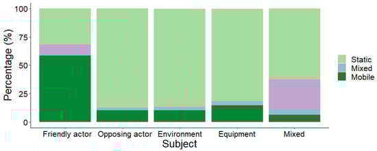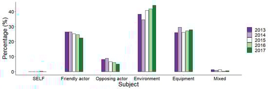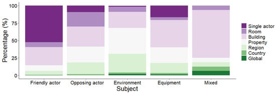 Figure 39 reveals an interesting observation that the deployments are more and more likely to target a wider subject area as the observation of friendly and opposing actors (124/34.54% to 105/27.41%) is slowly decreasing in favor of wider subject areas such as equipment and environment (230/64.07% to 276/72.07%). The tendency together with the actual scales leads to thinking that the interest of research community had started this trend before the observation period and that the main focus nowadays is on subjects that we see and with which we interact. It might be connected with the world’s fight with climate and the increased attention towards carbon footprint from technology leading to the change of prioritizing the field of Environment and, therefore, increasing funding in this field of research.