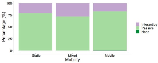 Table 4 shows that typical deployment does not provide interactivity (Passive), meaning that it only senses and gathers data for later or remote analysis without feedback/actuation. Only 20.55% (375) of deployments are equipped with actuators and, therefore, can react to the changes in the world around them. Two of the deployments had no clear information on interactivity of the target deployment in the article (None).
