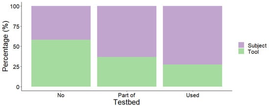 In the case of deployment being “part of” testbed facility, this is only found in the Research domain (15/100%). It could be related to the rather well balanced distribution between science and industry through TRLs, where development of testbeds itself is left to scientific institutions, and not the R&D departments of corresponding industry subjects.