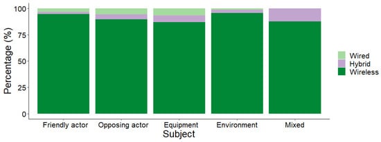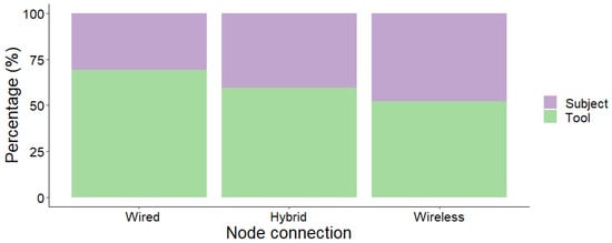 Figure 37 adds to the result expressed previously, sensor networks deployed as tools tend to be wired—wired: 65/69.15%, hybrid: 53/59.55%, wireless: 1493/52.50%, and sensor networks deployed as subjects lean towards being wireless—wired: 29/30.85%, hybrid: 36/40.45%, wireless: 1367/47.80%. Again, if we design the tool, it is a lot easier to plan for wired connections.