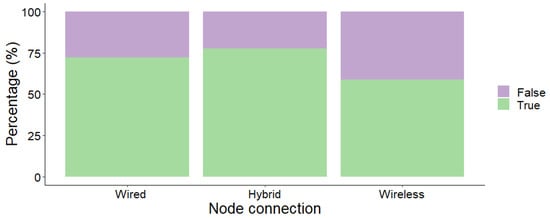 Considering connection type in regards to the field of the deployment, wireless connection is used equally (between 85% and 100% of total) for all fields except for research (65% of total), where it is used to a lesser extent. This also adds to the argument mentioned previously—when the research is planned, it is usually possible to easily plan for wired connections unless the target is not suitable for wireless deployment.