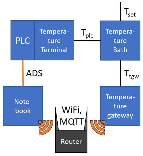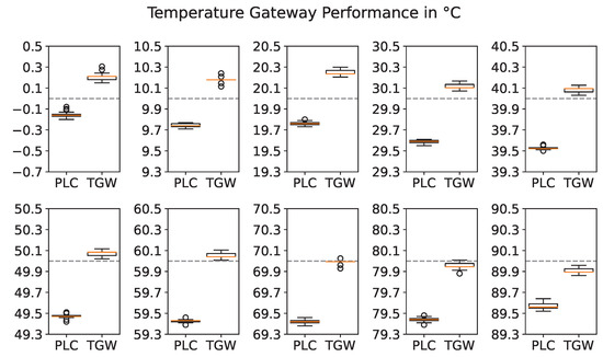 Figure 5 depicts a schematic view of the experimental setup for the performance analysis of the TGW. Both the PLC and temperature GW were connected to a 4-wire PT100 temperature sensor with class 1/3 DIN accuracy. On the PLC, the terminal EL3202-0020 from Beckhoff® was used, which was specified with a resolution and a accuracy. The temperature bath was an LR-Cal FLUID 100, which allowed setting the temperature of the thermal oil in a range of −12 to 125 . In the experiment, the temperature was varied from 0 to 90 in 10 steps, which covers most applications in BAS (As audit documents are rarely shared, compare, for example, the development in district heating and cooling networks’ temperature levels [41,42]. Using boilers or combined heat and power as the primary heating source will keep producing high temperature levels). Each setpoint was held for 600 after the temperature bath reported a steady-state condition, corresponding to 600 samples at a 1 sample rate.