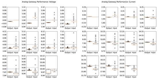 The maximum relative deviation barely reached about 7% due to some outliers at the 1 set voltage. Over all measurements, the output interfaces showed very small quartile bands, suggesting a reliable operation, especially in terms of the repeatability. The input boxplots show considerably more outliers than the results from the output, suggesting noise in the measurement chain, which utilizes the external ADC. This noise can be the result of a direct coupling of external noise sources on the signal wires or, rather, due to internal noise affecting the ADC voltage reference. Moreover, the input values for the current and voltage test did not exceed the minimum and maximum range of the tests for 0 and 10 and 0 and 20 . These limits resulted from the operational range set in the firmware, which did not allow any measurements outside the given range to be sent to the broker.