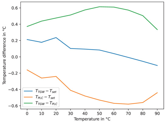 Similarly, because the temperature bath is not a certified high-precision device, we rather evaluated the deviation from the PLC measurements as our benchmark. The effects became more obvious when observing in detail the development of the deviations with the set temperature of the temperature bath. In Figure 9, the blue and orange curves represent the median deviations between TGW and the set temperature or the PLC and the set temperature, respectively, and the green line corresponds to the median temperature difference of the TGW and PLC over the set temperatures for the temperature bath. In the analysis, the temperature point granularity was chosen to 10 , and due to the assumed linear behavior of the Pt100 sensor element, e.g., the Pt100 element is considered to have a linear relationship between temperature and resistance, it is expected that intermediate points can be obtained by interpolation. The temperature point granularity is further supported by the Physikalisch-Technische Bundesanstalt (PTB), suggesting at least three different temperatures (calibration points), which are distributed as evenly as possible over the desired operating range of application [43]. In fact, as illustrated in Figure 9, at a set temperature of 20 , the temperature differences deviated significantly from an interpolated value between 10 and 30 . However, this anomaly was detected in both the PLC and TGW measurements and, thus, is most likely an issue with the reference temperature or, rather, the resulting temperature of the temperature bath control.