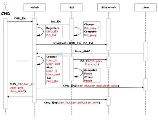 Initially, the admin registers the EAs of both the DS and CHD in the private network and copies of the EAs are then stored in the private blockchain ledger as demonstrated in Figure 2. The admin assigns an identity and password to the user’s device and then maps the user’s device to its corresponding CHD. Then, , and MAC address () of the user’s device are shared with all primary stakeholders via the blockchain network and a copy is also stored in the private ledger. The DS chooses a private key and computes its public key using a point (P) on the elliptic curve as: , then using its EA (), it broadcasts all its parameters as on the blockchain. Similarly, using a one-way hash function and , the DS computes a password verification code as given in Equation (1), and then stores it in its memory. Figure 2 gives the detail processes applied during the registration stage of the proposed IPChain model.