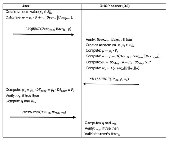 Thirdly, the one-way hash function and elliptic curve discrete logarithm problem (ECDLP) are utilized together with blockchain and Diffie–Hellman key exchange method in the initial validation procedure. It is used for user and DHCP server two-way authentication, session key exchange, and digital signature generation. The DSSC protocol approach uses digital signatures established during the initial validation procedure to validate the authenticity of DHCP packets sent between the user and server.