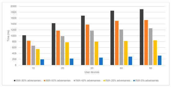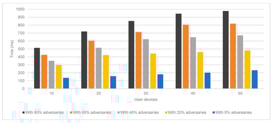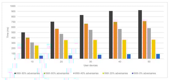 As seen in Figure 4, Figure 5 and Figure 6, the proposed IPChain model loses part of its robustness as the number of system components increases owing to an increase in processing latency. This is because as the number of user devices rises, so does the possibility that there will be a greater number of adversaries inside the system. Moreover, this increases the time necessary to process messages inside the DS for user or packet authentication. In addition, it is self-evident that the system’s robustness will decrease if the number of adversaries increases while the number of users whose identities are validated remains the same. This is because an increase in the number of adversaries will lead to an increase in the number of attacks, which in turn will result in a decrease in the number of legitimate users. Notably, the DS will reduce the rate at which it processes authentication packets as the proportion of adversaries in the system increases. In turn, this stops adversaries from obtaining legitimate authentication packets. Thus, even with an increase in the number of adversaries in the system, the findings reveal that the proposed approach has a high level of resilience, since it can prevent the adversary from completing the attack effectively.