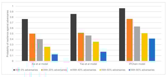 This research defines the resilience of our model to the relevant threats as the ratio of the probability of resilience against adversaries in the system to the percentage of adversaries at a given moment. In this study, the robust performance of IPChain is compared to Yao et al. [13] and Xie et al. [31] benchmark models. Figure 7 depicts the outcomes of the study, which were conducted to determine the resilience of each model against an increasing number of adversaries in the system.