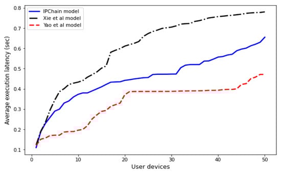 In our proposed model, the authentication latency for a rising number of user devices in the network, up to a maximum of 50 devices, was recorded, measured, and compared with those of Yao et al. [13] and Xie et al. [31]. The latency was assessed based on the system’s processor timer that operates during the authentication operations and network interactions. Figure 8 demonstrates that the proposed IPChain model has a higher execution latency than Yao et al. [13]. This is due to the security techniques used, which include a one-way hash function, the Diffie–Hellman key exchange mechanism, the elliptic curve discrete logarithm problem (ECDLP), blockchain technology, and smart contract features.