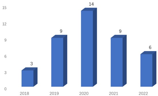 In this subsection, we analyze the paper according to the method in Section 2.1. We searched for related keywords on Scopus on 5 July 2022, and returned a total of 181 articles. We repeatedly selected 41 papers that were most relevant to our research. These papers are all related to privacy protection in blockchain-based IoV, including identity privacy, location privacy, and data privacy. Figure 1 displays the year of publication for the selected publications. The included articles were published between 2018 and 2022, with a steady rise between 2018 and 2020. The number in 2021 is the same as that in 2019, and the lower number in 2022 is because the retrieval result only involves papers published before August. We expect more papers to be accepted and published in the next couple of months.