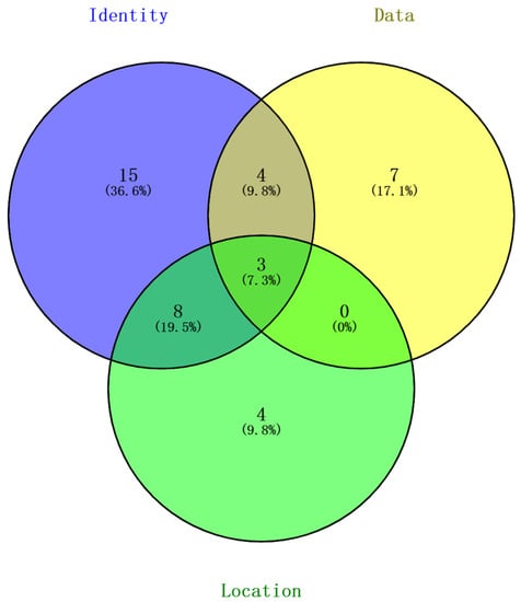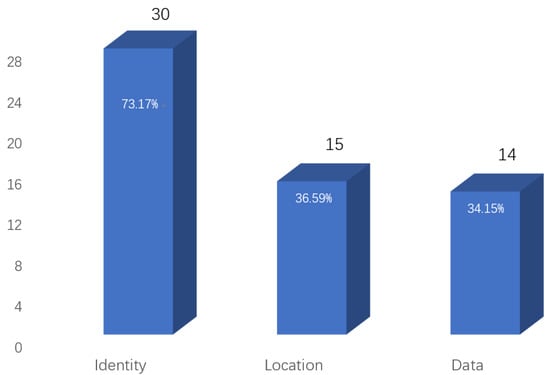 Considering the forms of privacy protection offered by the blockchain technology for the IoV, most of the papers (73.17%) we surveyed focus on protecting vehicle identities, called identity privacy. Location privacy (36.59%) and data privacy (34.15%) were roughly equal in volume. The vertical diagram of the three privacy types is shown in Figure 2. However, most of these documents do not offer a solitary type of security for the user’s privacy. As shown in Figure 3, the Venn diagram reveals that 8 (19.51%) of the papers provide privacy for both identity and location, 4 (9.76%) provide privacy for both identity and location, and 3 (7.32%) provide all types of privacy.