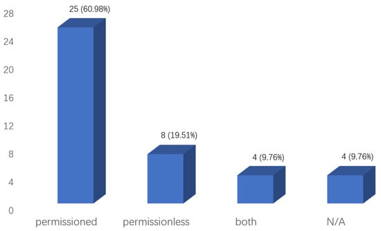 Classifying the different categories of blockchains [], 25 solutions (60.98%) proposed schemes based on the permissioned blockchains, 8 papers (19.51%) use permissionless blockchain, and 4 studies (9.76%) use both permissioned and permissionless (i.e., hybrid) blockchains. As seen in Figure 4, 4 (9.76%) articles do not specify the type of blockchain employed in their solution.