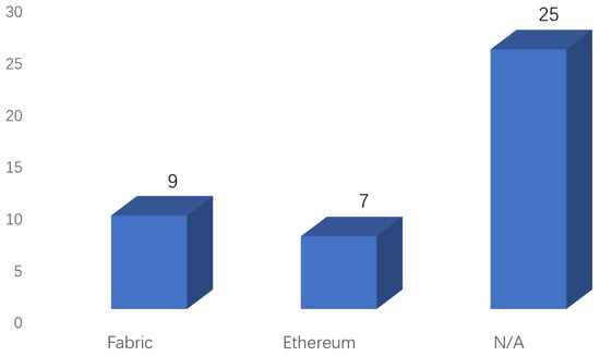 Among the selected papers, Hyperledger Fabric (21.95%) and Ethereum (17.07%) are the most commonly used blockchain platforms in the proposed schemes (see Figure 5). In comparison, most papers (60.98%) do not mention a specific blockchain platform.