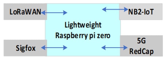 Multihomed LHM-N Gateway: This contains multi-radio interfaces that are built on top of a lightweight Raspberry Pi Zero. The multi-radio interfaces include Sigfox, LoRaWAN, RedCap, and NB2-IoT. The block diagram of the multihomed LHM-N gateway is shown in Figure 2. It communicates with EDs through its various interfaces, then transmits collected information via the main backhaul 5G private network over the license-free band to various designated servers. If the 5G private network is not available, the information destined for the 5G core network server is routed via a licensed 5G public network as an alternative backhaul for data delivery.