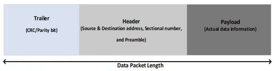 Phase 1: Packet-Size Forwarding Engine Algorithm: The function of the packet-size forwarding engine (PSFE) algorithm is to forward packets from the multihomed input interface to the appropriate output chipset interfaces. This will enable each chipset interface to transfer the packet to its final destination. The PSFE algorithm will forward data packets to appropriate interfaces based on their respective payload size threshold. Specifically, data packets forwarded or destined to the 5G RedCap IoT device interface will work according to the optimized model transmission mechanism. However, data packets forwarded to other interfaces will be transmitted normally. The data packet format has three major field parameters, which are represented as header, trailer, and payload. The header contains source and destination information, including fragments and the current sectional numbers. The trailer field includes a frame checksum sequence for error control with cyclic redundancy check (CRC) or parity bits. The payload is the actual data information being transmitted. Each field holds a size or length of data bits; the header and trailer have a smaller length, while the payload has a longer length containing the actual data bits information. Figure 3 shows the packet length information. Actually, packet forwarding uses information in the header field to forward the payload data to the appropriate chipset interfaces.