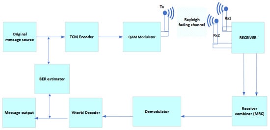 The implementation is conducted in MATLAB. Reliable results are achieved in modeling and simulations that are based on discrete events simulations (DES). For instance, an autoregressive integrated moving average (ARIMA) based on the DES method was used to generate a reliable result with minimal error in smart framing [46]. Further, soft computing optimization based on the DES approach was used for the modeling and simulation analysis for a reliable mechanized operation solution [47]. Hence, the LHM-N model is based on DES. The illustrative phase of the LHM-N model implementation is shown in Figure 4. In the simulation, a random binary bit stream was created. The bit stream is then encoded into a convolutional code by the TCM encoder. The coded bit is then mapped to a 16-QAM modulator, which modulates the coded bit streams. A Rayleigh fading channel is then added to the modulated data in order to simulate a multipath fading channel. Then, the MRC combines the data received by the two receivers, which the simulation prepares for demodulation and decoding by the Viterbi decoder. Finally, the simulation compares the decoded information with the original bits streams in order to compute the bit error rate (BER).