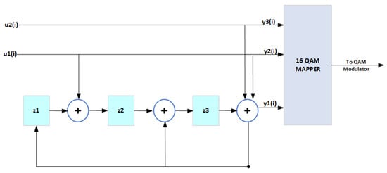The TCM encoder is represented by () convolutional code parameters; where n is the output, k is the input, and m is the memory register. The coding rate R is configured as . For example, means 2 input message streams and 3 coded output bit streams. This model considers (3,2,3) convolutional code, wherein z1, z2, and z3 represent the three memory registers, and . The constraint length L is determined by . Figure 5 depicts a coding rate of a TCM encoder, in which the coded bit stream is mapped by the QAM mapper to the QAM modulator. Hence, the convolutional code equation is given by,