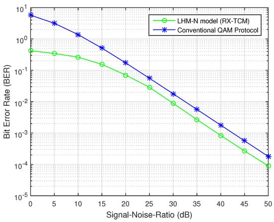 Comparative analysis of BER for LHM-N and the conventional QAM protocol.