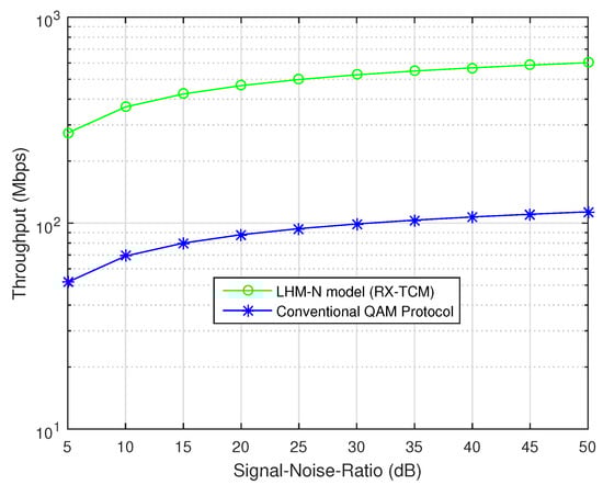 Comparative analysis of the throughput for LHM-N and the conventional QAM protocol.