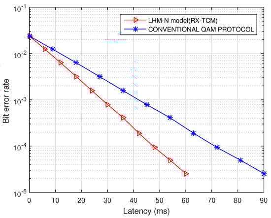 Figure 8 shows the performance of the communication signal transmission with respect to BER and latency over the Rayleigh fading channel of the LHM-N model compared with the conventional QAM protocol. From the result, it can be seen that at any instance of the transmission, the LHM-N model exhibits low BER as well as a lower latency compared to the conventional QAM protocol For example, the transmission latency is 30 ms with a BER slightly below 10 in the LHM-N model. Whereas at the same BER of 10, the transmission latency or delay was 45 ms in the conventional QAM protocol. This validates the lower latency or delay in the LHM-N transmission than in the conventional QAM protocol.