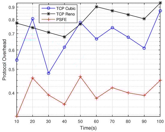 Figure 9 shows comparisons of the protocol overhead for packet forwarding transmission. From the three evaluated algorithms, the PSFE algorithm outperforms TCP Reno and TCP Cubic algorithms with very low protocol overhead throughout the simulation runtime during the packet-forwarding transmission. The PSFE has a maximum attainment of 0.5 protocol overhead. This is the least attainment of protocol overhead compared with TCP Reno and TCP Cubic, whose maximum protocol overheads are 0.9 and 0.8, respectively. Hence, the TCP Reno and TCP Cubic encountered higher protocol overhead due to the frequent packet forwarding in their algorithm’s criteria. This causes excessive overhead for the packet header and trailer, which can lead to packet loss errors, sluggish network, congestion, and high energy consumption on the device. However, the PSFE maintains conditional properties based on a given threshold for packet forwarding. This allows only accumulated packets to be forwarded based on the conditional criteria leading to minimal protocol overhead. The minimal protocol overhead can be attributed to enabling congestion avoidance in packet-forwarding transmission.