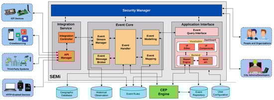 This layer represents the underlying middleware services used by the SEMi core layer. There are four key components: (i) the Data Sources involves various sources of data in multiple platforms spread across the city. The Data Sources may include IoT sensors related to urban environments and other data capturing devices/citizens including mobile apps, social media, third-party data, HTTP-enabled devices, etc.; (ii) the Data Manager is responsible for dealing with all requests and streams of data received via the Application Interface, Event Core, and Integration Service, besides providing access to databases and supporting the synchronization of stored data. The SEMi uses a set of databases to store data. Hence, this component functions to manage the persistence of data and event streams. For instance, all observation data is collected in the Historical Observation Database whereas, in the Geographic Database, the geographic information is separately stored and used to query with geographic data processing. The Event Rules Database stores the rules provided by users for detecting the incoming streams of data, besides the Event Repository performing data analysis in the CEP and the visualization dashboard; (iii) the Users, playing a vital role in SEMi, adopt two roles: (1) city administrators/developers who are behind the need for information focusing on monitoring/detecting the current status of a city, performing general/advanced event queries for people or organizations, advanced visualization settings with the SEMi visualization dashboard, configuration data access policies, executing and scheduling data import tasks, etc.; (2) people and organizations who are general-purpose users that are typically transient and respond to the needs and desires of individuals or the public sector; those are able to use SEMi with data edit, event querying and visualization capabilities; and (iv) the CEP Engine component is responsible for real-time event processing received by SEMi to identify the occurrence of complex events.