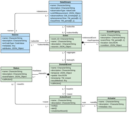 The main contribution of this section is to propose a data model supporting interoperability which is an essential requirement for event-driven smart city solutions. The proposed data model, called the Event-driven City Data Model (ECDM), is inspired by the Open Geospatial Consortium (OGC) SensorThings data model that is currently an OGC standard. In an attempt to solve the problem of interoperability, a platform-independent and model-driven approach for event processing has been proposed. A key to building the ECDM expressing and simulating event-driven processes includes not only the elements but also a description of their relationships. A form of the conceptual data model is displayed in Figure 2. The core of the model is centered around the Event that represents a simple event derived by data streams (DataStream) and it is composed of properties/features (EventProperty) in a specific domain (DomainEvent). DomainEvent is derived by mapping raw events to domain concepts. Then, it is synthesized into Status, which describes the overall relationship of events in such a domain. Based on the Status, the ActionEvent plays a role in the planning step which yields a sequence of actions appropriate to the Actuator or a certain situation. Event entity also links to the DataStream representing a sequence of one or more Observations belonging to a Sensor or a source of data.