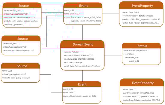 We apply the ECDM to a case study that illustrates how entities and events may be modeled for a specific domain. The example case scenario is an air pollution domain, where the two particular situations including PM2.5 and carbon monoxide in certain areas are going to be considered. From the conceptual model in the previous section, Figure 4 shows how different aspects of the air pollution domain can be modeled via class entities. The DomainEvent entity is given the details of the air pollution domain, especially time (e.g., 2022-04-30:8.00AM–2022-04-30:9.00AM, collecting data every 5 s) and space (e.g., “Trang”). In addition, it utilizes “Average” as a method to process the results. In order to monitor the air quality, two events are associated with this domain including the event monitoring PM2.5 (E1) and the event detecting carbon monoxide (E2). Each event entity contains a general description (such as even-id, name, description) and gathers data streams from different heterogeneous sources (such as sensor, social media, csv-file).