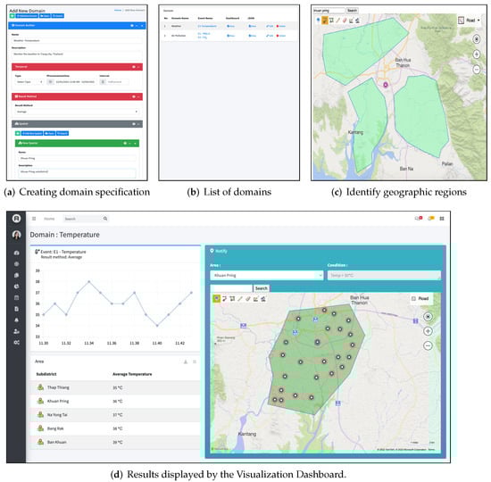 The SEMi application interface, shown in Figure 5, was implemented in a Python module using the Flask web framework as server-side development whereas the SEMi visualization dashboard was implemented in the JavaScript and the Vue.js framework. JavaScript libraries are used to manage and edit geographic points on the map. The SEMi Dashboard provides a user interface that interacts with the SEMi core, thereby enabling users to perform event queries and view graphs and time series of event detection. Eventually, the SEMi implemented Security Manager features between the following components. Between the sensing sources and the Integration Service, we implemented basic access authentication over HTTP, using a user name and password; between the Event Core and the CEP Engine, we implemented SSH over TCP/IP using public keys; and between the CEP Engine and the Application Interface, we used data encryption using HTTPS.