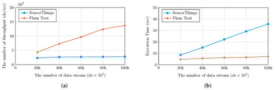 The comparison between two different data sources (1) SensorThings, and (2) Plain Text in two metrics including throughput and execution time: (a) The relationship between throughput and the number of data streams; (b) The relationship between execution time and the number of data streams.