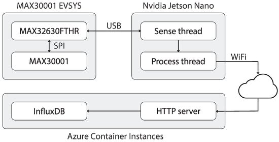 The sensor-edge-cloud architecture is composed of a MAX30001 EVSYS as ECG sensor, an Nvidia Jetson Nano as the edge device, and an HTTP server with InfluxDB database deployed to Azure Cloud Instances.