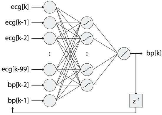 Blood pressure is inferred from the ECG signal with a NARX model with an ANN. The ANN in the model is a multilayer perceptron with 100 current and past ECG inputs and 2 delayed BP inputs as shown in Figure 2. The hidden layer consists of 10 neurons with a hyperbolic tangent activation function, while the output layer has only 1 neuron with a linear activation function. The number of ECG inputs (i.e., 100) was chosen to ensure that the ECG peak is still in the input values while predicting the BP peak. As those peaks are typically less than 0.8 s apart, 100 samples at 125 Hz is sufficient to realize this []. Since the MAX30001 samples the ECG at 128 Hz, the margin is slightly reduced to s which is still sufficient. Therefore, no modifications were made to the original network for this application.