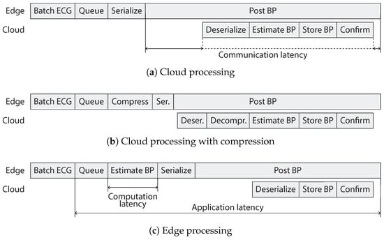 The main metrics for the performance evaluation are application latency, communication latency and volume, and power usage. Application latency (Figure 3c) is defined as the time required to compute and store the BP values starting at the time the segment is placed in the queue. Communication latency (Figure 3a) is the time required to transmit a segment of data to the cloud and send confirmation back. This includes the time required to ingest the network packets before they are processed, as Cooke and Fahmy [] have done in their study. The communication volume is measured as the number of bytes per message sent to the cloud, without HTTP headers. Power usage is the overall power usage of the edge device. In order to acquire more insight into the latency metrics, additional time measurements of significant steps as shown in Figure 3 are collected during the process. Each time measurement is measured with nanosecond precision relative to a single system clock, therefore no clock synchronization between edge and cloud is required. Clock rate differences could have a small effect on the measurements, but these effects are negligible compared to other effects such as network latency and thread scheduling.