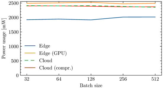 The mean power consumption of the edge device for different approaches and batch sizes confirms that edge computing is beneficial for reducing power usage.