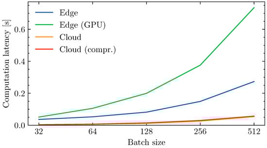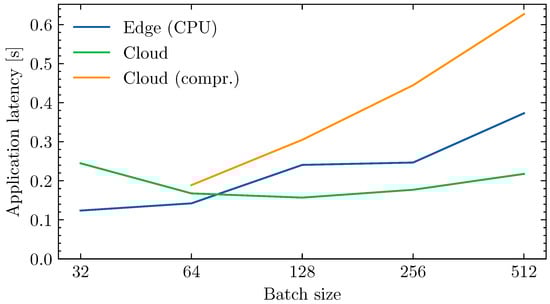Application latency is a complex measurement, including multiple data operations that affect the measurement differently. In order to understand the results better, it is interesting to break the measurement down as shown in Table 2 for batch size 128. For these, the cloud computing approach resulted in the lowest latency, mainly due to lower computation time. Compression does not reduce application latency; it introduces additional operations and increases the latency of existing operations. The communication latency for the edge approach is slightly higher in this case, probably due to network indeterminism. The network between the mobile device and the cloud node is used by millions of other devices, which causes the network performace to be time-variant. In this case, the network performance was degraded due to more traffic caused by other devices. In order to understand these results, both communication and computation latency are isolated and discussed on their own.
