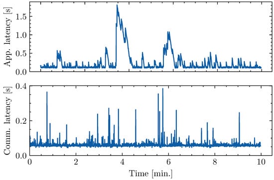 When peaks in the communication latency occur, the application latency tends to increase quickly right after. Consequently, we can state that the variability in application latency is mostly dependent on the connectivity between the edge device and the cloud.