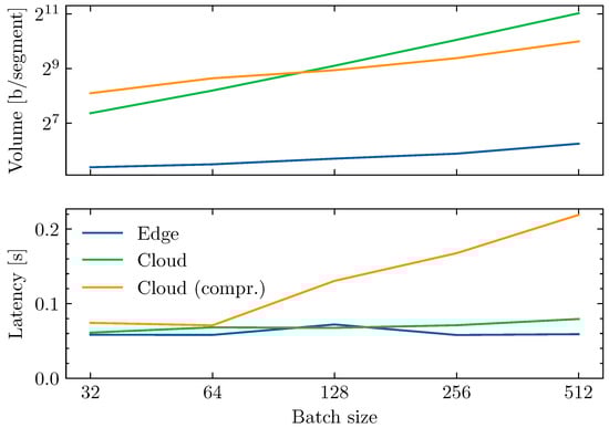 Naturally, message size increases with the number of samples in that message. With edge computing, the message consists of BP values at a significantly lower sample rate than the ECG signal, reducing the size. Applying compression to the ECG data limits the message size, but only when the batch size is large enough. Due to the introduced overhead during compression, data size is only reduced for batches with more than 128 samples. As batch size increases, the compression ratio increases to 2.04 for 512 samples. Compared to the reported ratio of Tsai and Kuo [] (i.e., 2.77), the lower compression ratio we achieved could be attributed to shorter signals and differences in test data. Although message size increases with batch size, the total transmitted volume over 10 min decreases with batch size as there is less overhead in the message. The edge computing approach with batch size 512 is the most efficient regarding transmission volume, transmitting only 11.31 Kb over 10 min (see Figure 7).