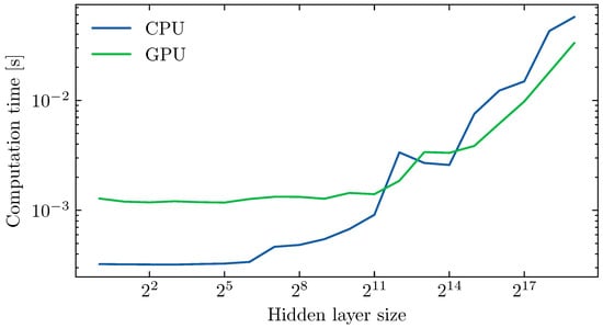 The most striking result to emerge from the data is that GPU acceleration does not decrease but increase the computation time. A separate experiment was performed to study this effect in detail. A fully connected network with 102 inputs, a variable number of hidden neurons, and one output neuron was constructed, similar to the one that is used in the BP estimation. The average calculation time was then measured for an increasing number of hidden neurons with 500 random input vectors per iteration, both with and without GPU acceleration. As can be seen in Figure 9, calculation with GPU acceleration is only faster for networks with more than hidden neurons. The calculations to be performed on the GPU are defined by CUDA kernels. Launching a kernel and transferring data between CPU and GPU causes significant overhead on the calculations if the amount of work performed by the kernel is too small []. As the network in this study has just 10 hidden neurons and the use of the GPU increases power usage, the GPU should not be used for this application. Optimizing the GPU acceleration can be performed using several techniques such as increasing the amount of work per kernel call, but these optimizations exceed the scope of this study.