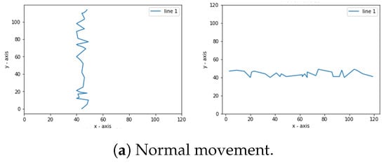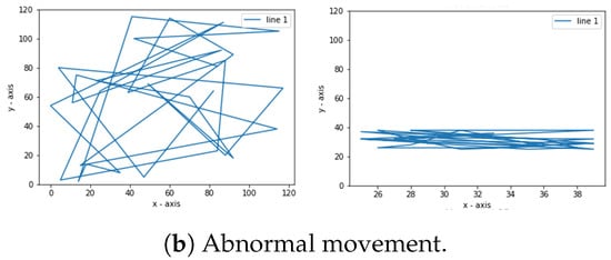 The step process is obtained by making a simulation with x and y coordinates. A normal movement is a straightforward step or a zigzag in a straight line. In the simulation, as shown in Figure 2, for the program created using the ascending sorting function. This sorting function can be placed on the x or y coordinates or both. The sorting function here is to sequence the steps so that the coordinates appear in the same direction. On the other hand, abnormal movements are back-and-forth motions. In Figure 3, the program does not use the sorting function, which means it only creates random points. Instead, the resulting dots are connected using lines. Figure 4 shows examples of normal and abnormal steps.