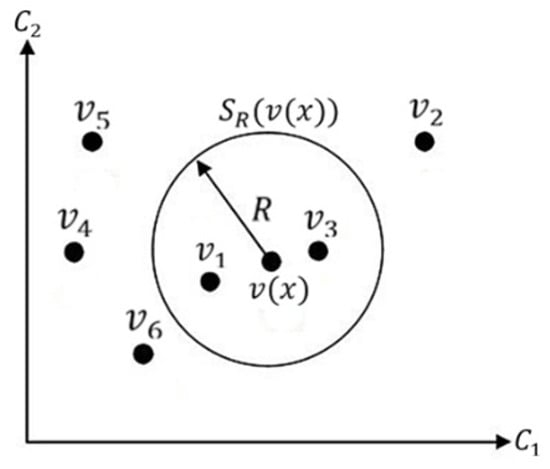 The pixel is classified by comparing values in the next frame. This comparison is made by defining a circular area , which has a radius R and a center point . An illustration of this stage can be seen in Figure 6.