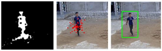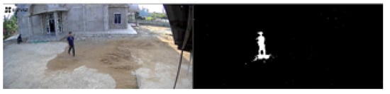 Next, the minimum cardinality threshold value is set. If the number of samples contained in from the circle area is more significant than #min, then the pixel is set as background. If it is smaller, then it is set as foreground. After classifying a pixel as either the background or foreground, the pixel is segmented by giving a value of 0 for the background and 1 for the foreground. Then, the median filtering technique was applied to reduce noise, resulting in a binary image of each frame, with moving objects detected in white while the background is black. Figure 7 shows an example of the segmentation results.