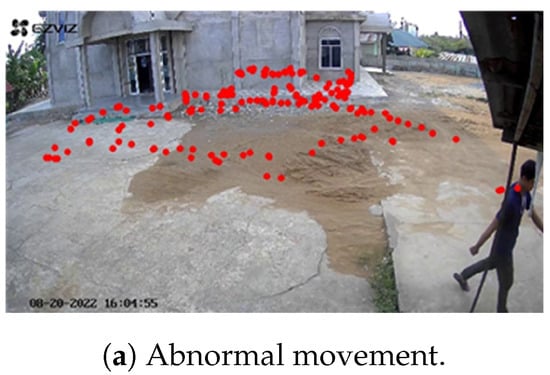 Key point extraction is performed when the similarity value between objects in the bounding box tracking and objects in the bounding box foreground is greater than 80%. Here are some examples of key point extraction results (the extracted key point positions are marked with a red dot). Figure 9 shows an example of the points of detection of both abnormal and normal human movement.